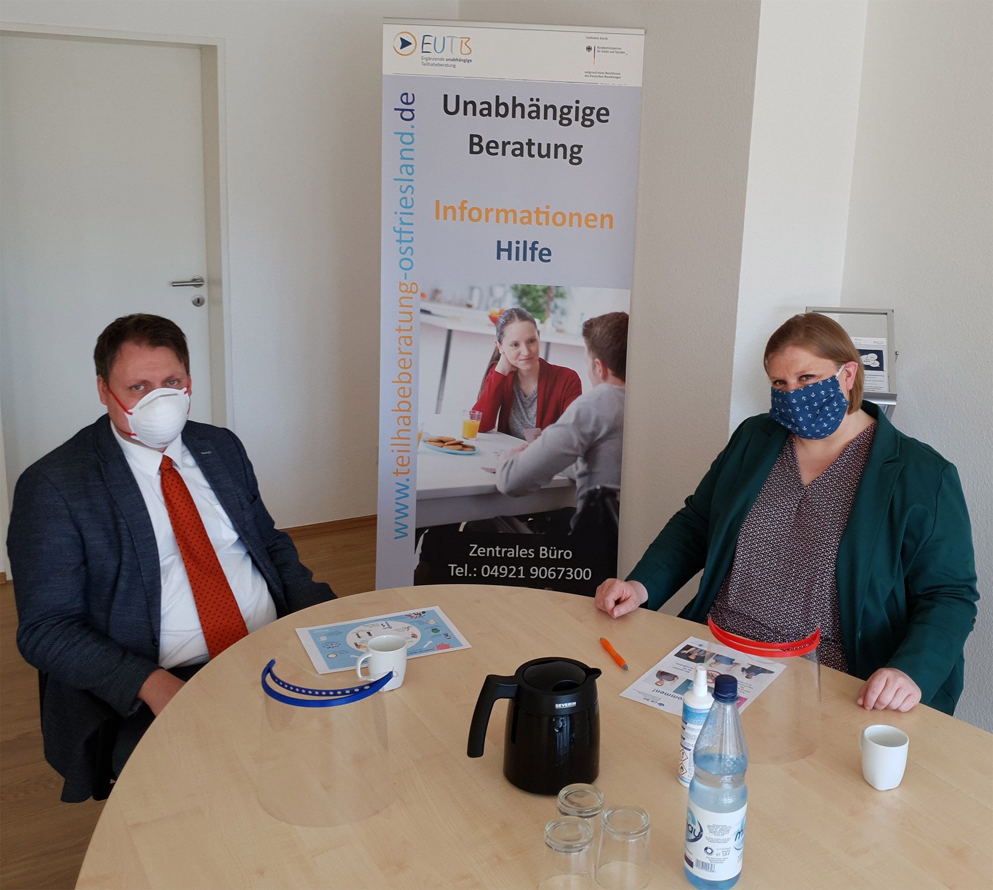 PLG_GSPEECH_SPEECH_BLOCK_TITLE Man habe sich für das Progamm „webex“ der Firma „Cisco“ entschieden- das Programm benötigt nur geringe Ressourcen. Man benötigt einen Computer oder Handy mit Internetfunktion und Kamera sowie Mikrofon. „Wir versenden eine Email mit dem Link zum Meeting, dann lädt man sich eine kleine App herunter, meldet sich kurz an und schon kann es losgehen“, erklärt Hilke Buhr den Prozess. Das Team um Christian Habl wird komplettiert durch Frau Elke Hartmann- Frey, die im Landkreis Leer Beratungen per Telefon, SMS und per E-Mail durchführt. Frau Hartmann-Frey berät im Landkreis Leer auch auf Englisch, Niederländisch und Plattdeutsch. Zusätzlich beherrscht sie die DGS sowie LBG (für Gehörlose). Persönliche Beratungen für Kunden aus dem Landkreis Aurich und der Stadt Emden finden vorzugsweise im Büro in Emden statt, Kunden aus dem Landkreis Leer können wohnortsnah beraten werden. Ein Mund-Nasen-Schutz ist selbstverständlich Voraussetzung- auch wird auf Händedruck o.ä. verzichtet. „Sowohl im Emder Büro als auch an den Beratungsorten im Landkreis Leer ist jeweils zusätzlich ein sog. „Spuckschutz“ aufgebaut, um die Ansteckungsgefahr für die Klienten so gering wie möglich zu halten“, berichtet Christian Habl. Hilke Buhr fügt hinzu, dass die Mehrzahl der Klienten zur Risikogruppe zählen und daher besondere Rücksichtnahme notwendig ist. Sowohl persönliche, als auch Online- Beratungen sind nur nach vorheriger Terminvereinbarung möglich.